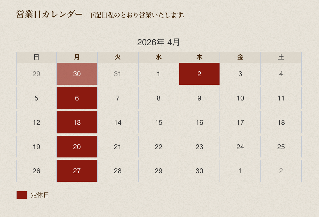 2026年4月定休日のお知らせです。