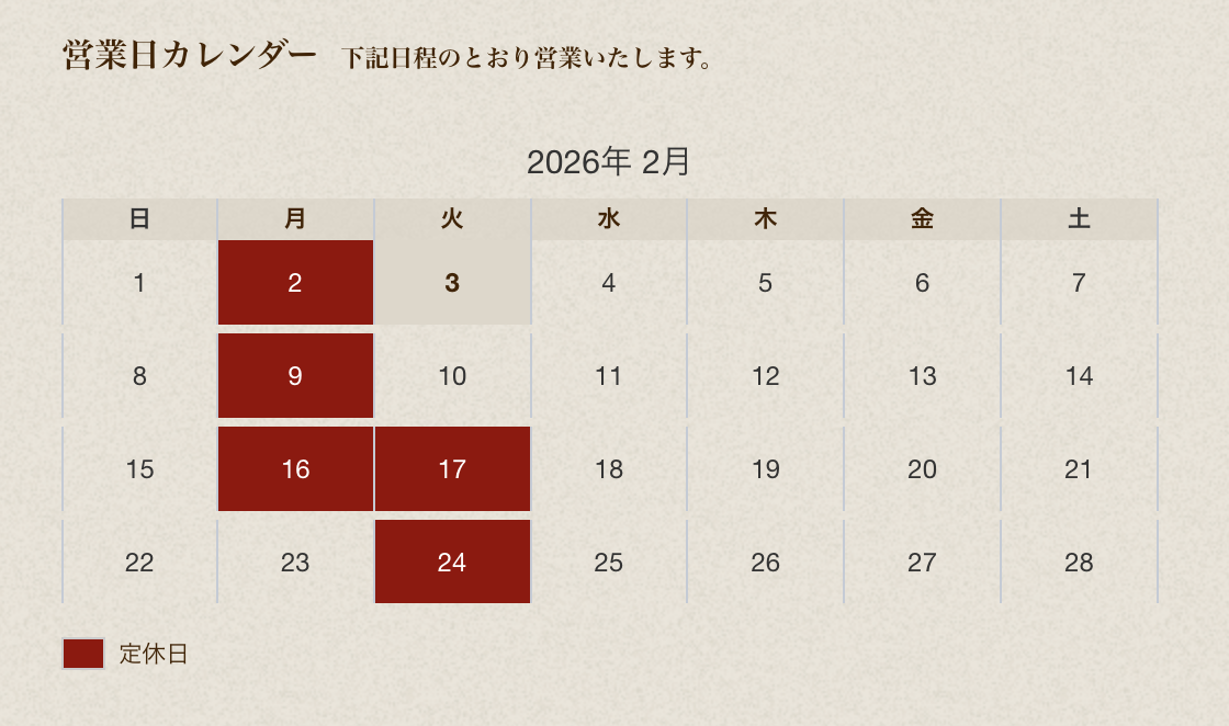 2026年2月、3月の定休日のお知らせです。 以下がお休みになります。